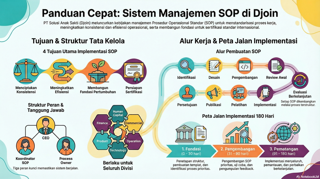 Course ini dirancang untuk mempersiapkan seluruh karyawan PT Solusi Anak Sakti (Djoin) dalam mengimplementasikan Sistem Manajemen SOP secara komprehensif. Anda akan mempelajari keseluruhan aspek pengelolaan SOP, mulai dari filosofi hingga praktik pembuatan dokumen yang sesuai standar.